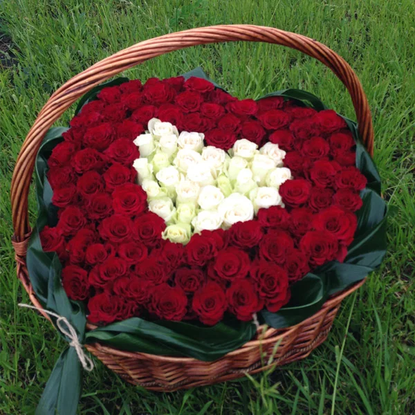 Великолепная корзина из красных и белых роз в виде сердца. Прекрасный подарок самому дорогому человеку,  который расскажет все о Ваших чувствах.