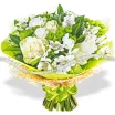 ДЕЛЮКС: роза белая - 15 шт., эустома белая - 10 шт., альстромерия белая - 11 шт., хризантема кустовая зеленая - 11 шт., фетр зеленый.