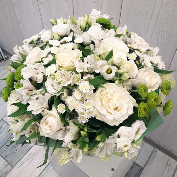 Стандартный (на фото): роза белая - 5 шт., эустома белая - 2 шт., альстромерия белая - 5 шт., хризантема кустовая зеленая - 4 шт., фетр зеленый.