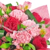 Роза красная - 15 шт, гвоздика розовая - 18 шт, альстромерия розовая - 14 шт, лист аспидистры загнутый - 9 шт, фетр красный.