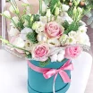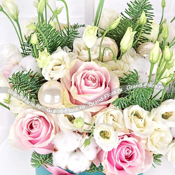 Стандартный: роза розовая - 7 шт., эустома белая - 6 шт., хлопок - 4 шт., ель, мини шарики - 4 шт., оазис, коробка, лента.