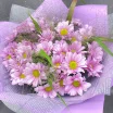 9 хризантем (на фото): хризантема кустовая розовая/сиреневая  - 9 шт.,  упаковка, лента