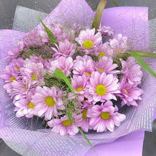Букет "Нежный поцелуй"- это идеальное сочетание красоты и нежности, созданное специально для тех, кто хочет выразить свои чувства и проявить нежность. В этом букете использованы красивые и свежие розовые кустовые хризантемы, которые идеально дополняются зелеными листьями, создавая неповторимый и роскошный аромат. Хризантемы известны своей красотой и символикой любви и нежности, и этот букет идеально подходит для дня вашей годовщины, дня рождения или любого другого специального случая, когда вы хотите проявить свою любовь и заботу. Этот букет также может стать идеальным выбором для признания в дружбе или благодарности. Он будет напоминать о вашей любви и нежности на долгое время."
